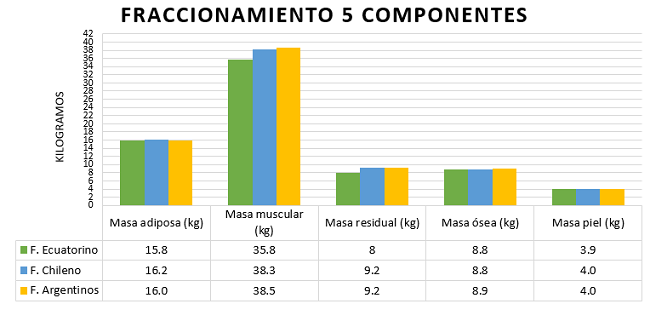 De acuerdo con el grafico 1, la masa adiposa, masa ósea y masa piel del futbolista nacional presentan mínima diferencia en promedio con respecto a los grupos de futbolistas internacionales. Análogamente, la mayor masa muscular la presentan los jugadores argentinos (38.5 ±3.4) y la menor los jugadores ecuatorianos (35.8 ±4.7). En el caso de la muestra de futbolistas ecuatorianos, son los delanteros los que presentan mayor masa muscular (38,8 ± 3,8), con respecto a los jugadores chilenos y argentinos ambos coinciden que son los arqueros los que presentan mayor musculatura (40.7 ± 4.1 y 41.5 ± 3.6) (Figura 1).