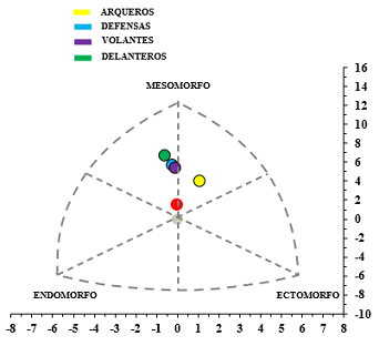 El somatotipo es favorable en disciplinas en la que la configuración del cuerpo podría influir en el resultado final del rendimiento (Gutnik et al., 2015). Por tanto, se evaluaron las 4 posiciones de juego de los futbolistas ecuatorianos, y estas coinciden con un componente mesomórfico predominante, siendo los delanteros los que presentan mayor muscularidad relativa con un somatotipo de 2.5-5.5-1.9, (Figura 2).