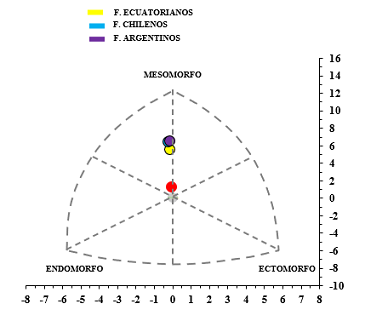 Fig. 3. - Somatotipo de futbolistas ecuatorianos, chilenos y argentinos