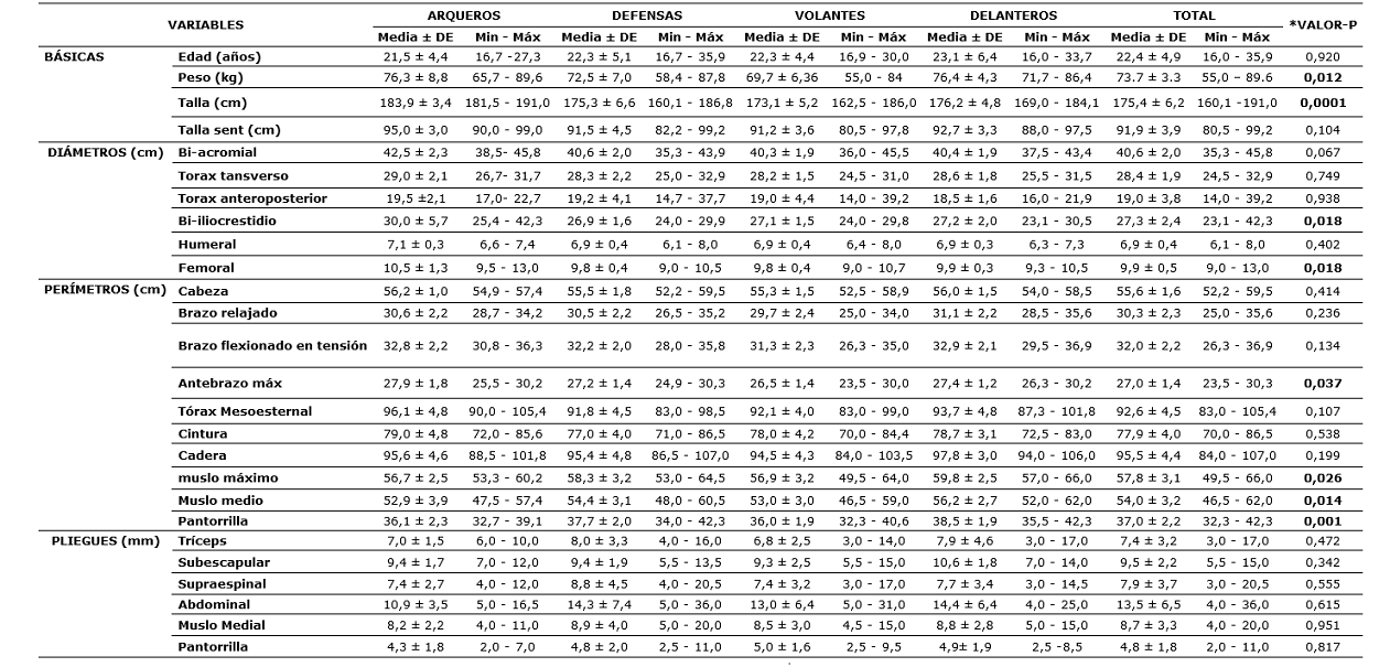 En la tabla 1, se detallan las medias y desviaciones estándar de cada una de las medidas antropométricas por posiciones de juego. Además, se muestra un valor p con significancia <0.05 (p. <0.05) según una prueba Anova en las cuatro posiciones de juego.