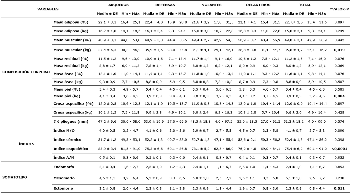 En la tabla 2, se detallan las medias y desviaciones estándar de la composición corporal, índices corporales y somatotipo por posiciones de juego. Además, se muestra un valor p con significancia <0.05 (p. <0.05) según una prueba Anova en las cuatro posiciones de juego.