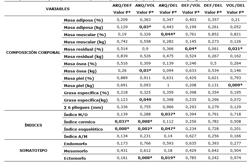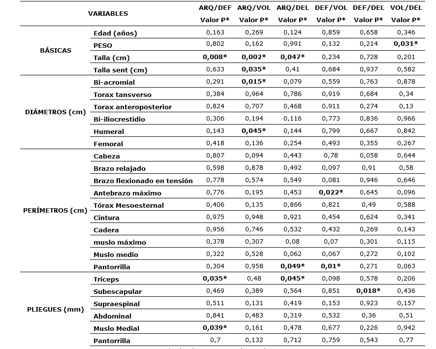 En las tablas 3 y 4, se detallan los valores p con significancia de <0.05 (p. <0.05) según una prueba T entre arqueros/defensas, arqueros/volantes, arqueros/delanteros, defensas/volantes, defensas/delanteros y volantes/delanteros para todas las medidas antropométricas (25 medidas), composición corporal, índices corporales y somatotipo.