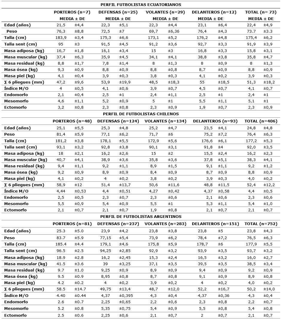 Se revelaron las características antropométricas, composición corporal y somatotitpo de los futbolistas ecuatorianos por posiciones de juego y promedio total. Los datos demostraron que si existen diferencias significativas en distintas variables estudiadas por posiciones de juego. Además, al cotejar el perfil antropométrico del futbolista ecuatoriano con otros grupos internacionales se destaca que difiere en medidas básicas con respecto a los grupos internacionales, presentan menor masa muscular y en relación a la masa grasa, sumatoria de 6 pliegues, índice musculo-hueso y somatotipo existe una similitud muy marcada.