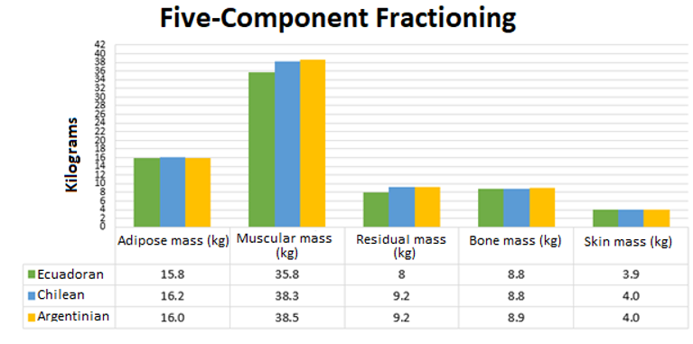 As to the sum of 6 skinfold thickness, the Ecuadoran soccer players have a mean of 51.3 ±18.2mm, while the Chileans and Argentinians have 52.4±12.2mm and 50.2±14.0mm, respectively. None differed significantly from the sum of 6 skinfold thickness reference in soccer (50 mm) (Holway, 2010). Likewise, Kasper et al. (2021) suggested "references for a sum of 8 skinfold thickness in high-performance players. Low 4 045 mm, mid 4 555mm, high 5 565 mm" (p.13). Although it is true that the skinfold sum is not a quantifier of fat kg, it is a very useful indirect indicator to determine if the fat levels are high, when compared with the same references, depending on the different sports disciplines.