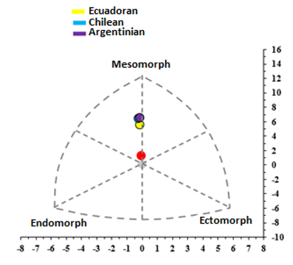 The Ecuadoran player's average somatotype is 2.4-5.1-2.3, and did not differ from the international groups, with a balanced mesomorphism (Carter and Heath, 1990) (Figure 3).