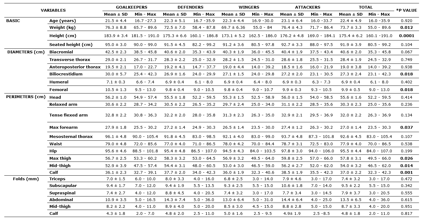 In terms of age, the goalkeepers had the lowest average compared to the rest of players, with no significant differences among the four positions of the game. The goalkeepers showed the greatest weight and height, with a significant difference from the other players. The attackers showed the highest average in the maximum thigh, mid-thigh, and calf perimeters, a significant difference from the other players.