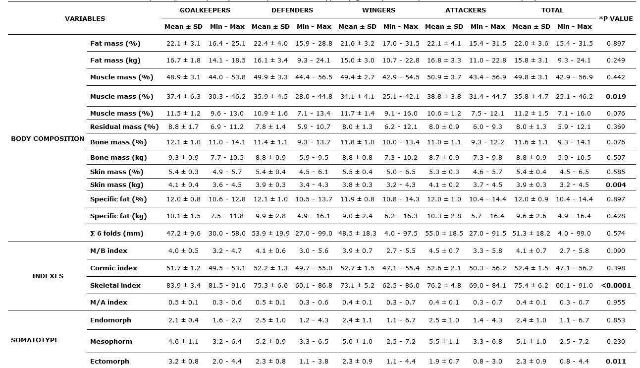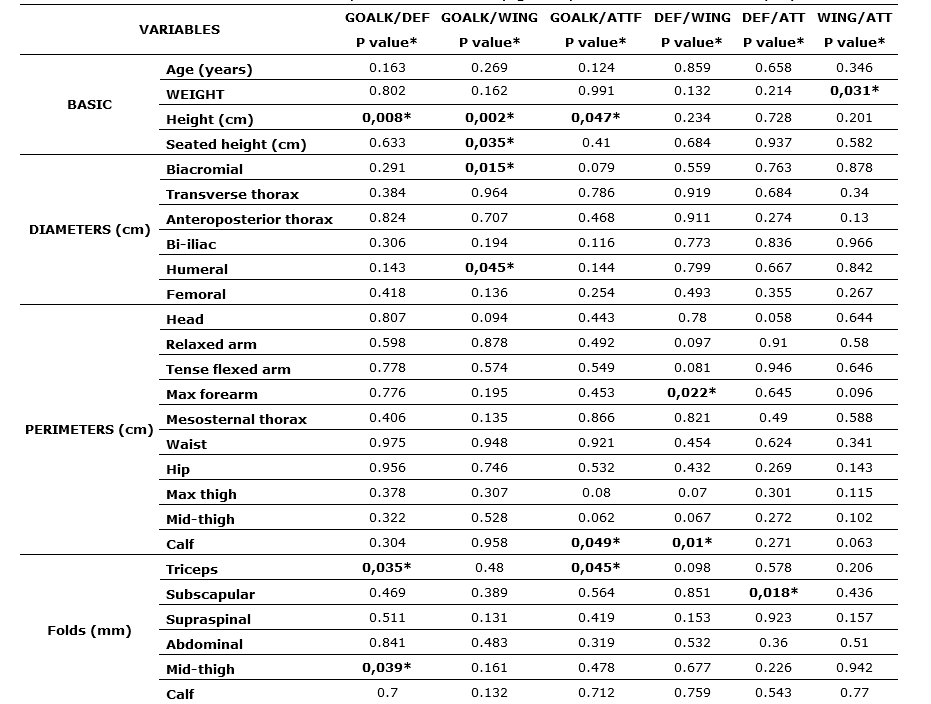 Tables 3 and 4 show p<0.05, according to a T test between goalkeepers and defenders, goalkeepers and wingers, goalkeepers and attackers, defenders and wingers, defenders/attackers, and wingers and attackers, including all the anthropometric measurements (25 measurements), body composition, body indexes, and somatotype.