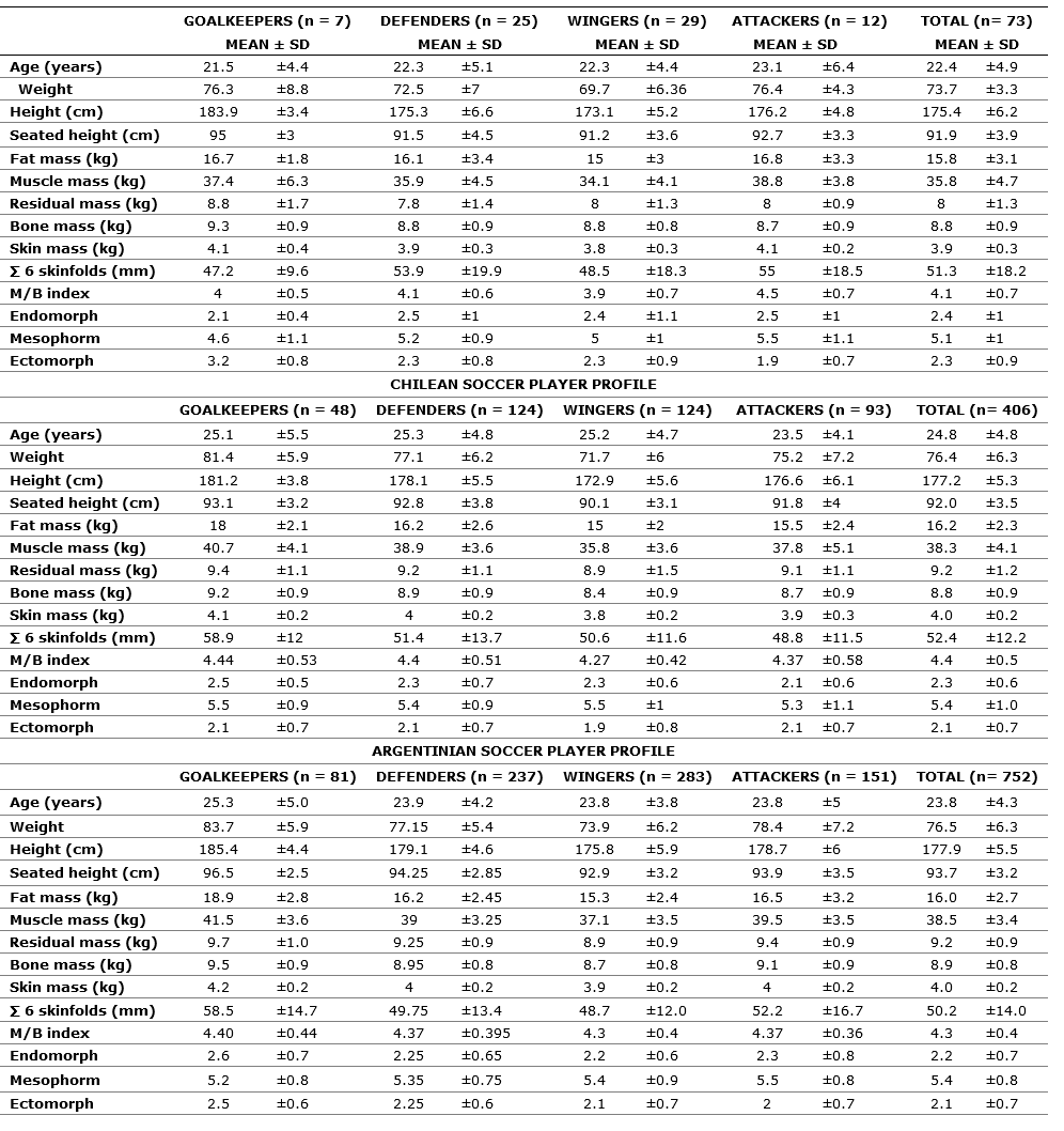 The anthropometric characteristics, body composition, and somatotype of professional Ecuadoran soccer players by position and overall average were determined. The data showed the existence of significant differences among the variables studied by game position. Besides, when matching the anthropometric profile of Ecuadoran players with international players, the former evidenced different basic measurements, with lower muscle mass. However, the fat mass, sum of 6 skinfold thickness, muscle-bone index, and somatotype were remarkably similar.